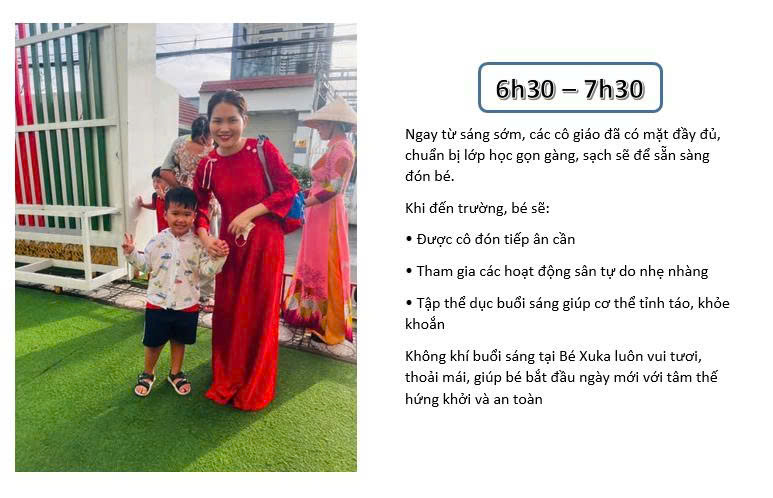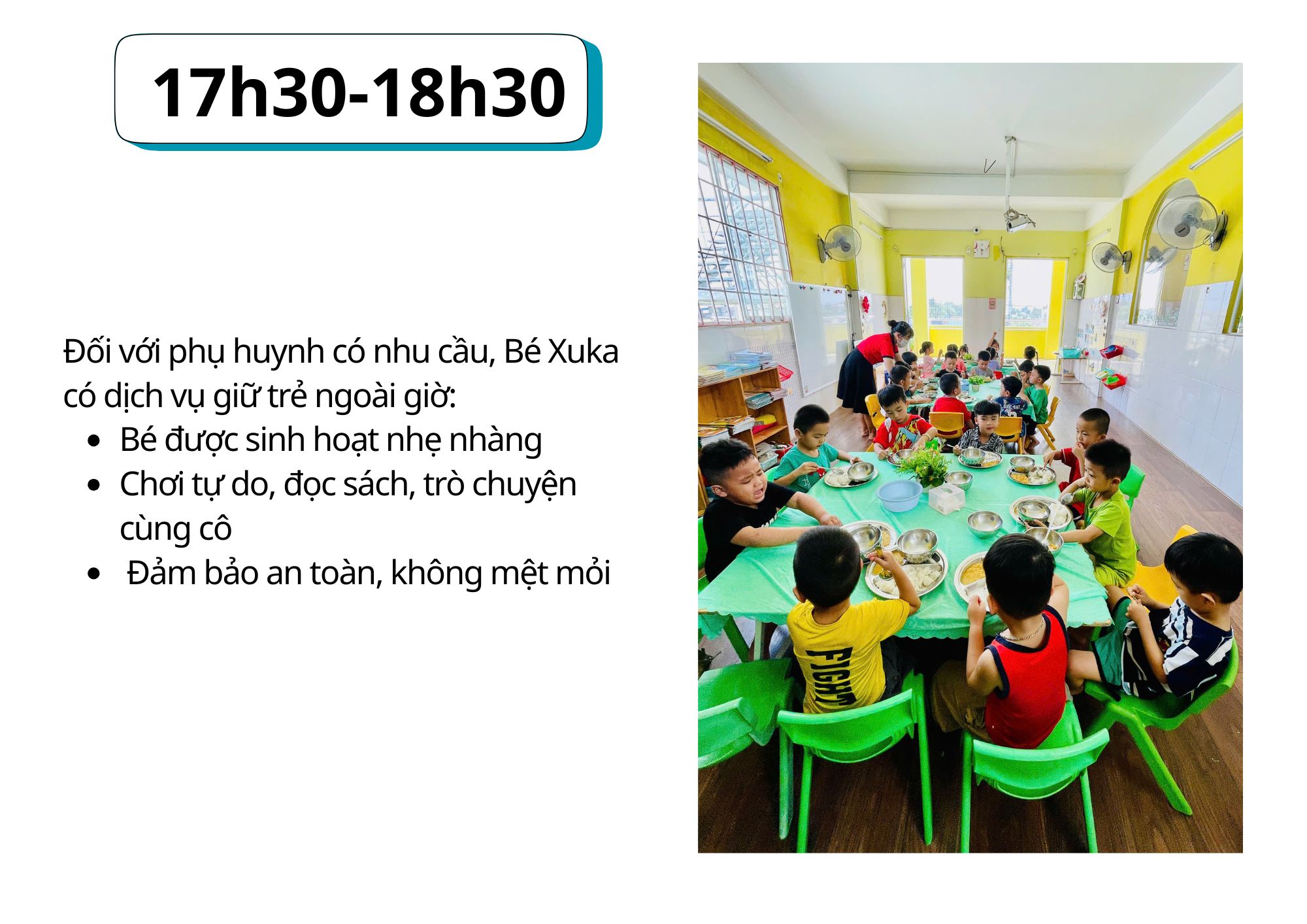 Một ngày tại Trường Mầm Non Bé Xuka trôi qua thật nhẹ nhàng nhưng đầy ắp những hoạt động ý nghĩa. Bé được chăm sóc chu đáo, học tập phù hợp lứa tuổi và lớn lên mỗi ngày trong yêu thương.